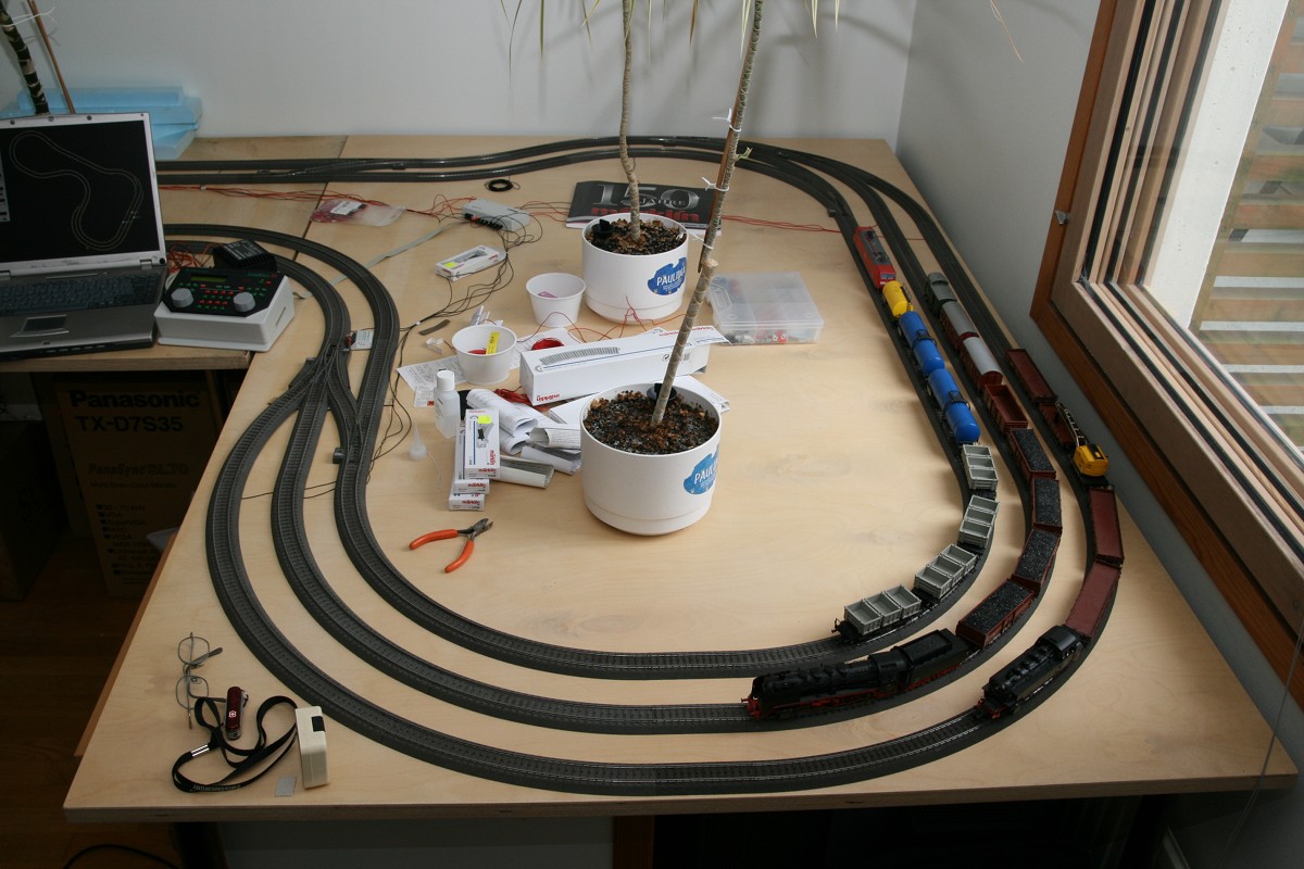 After moving to a new apartment, I had both tables available for the railway again. This time they were arranged in a fat "L" shape. The layout was fairly boring, consisting of a double-track loop with a short triple-track section. This was the first layout with full traffic control coverage.