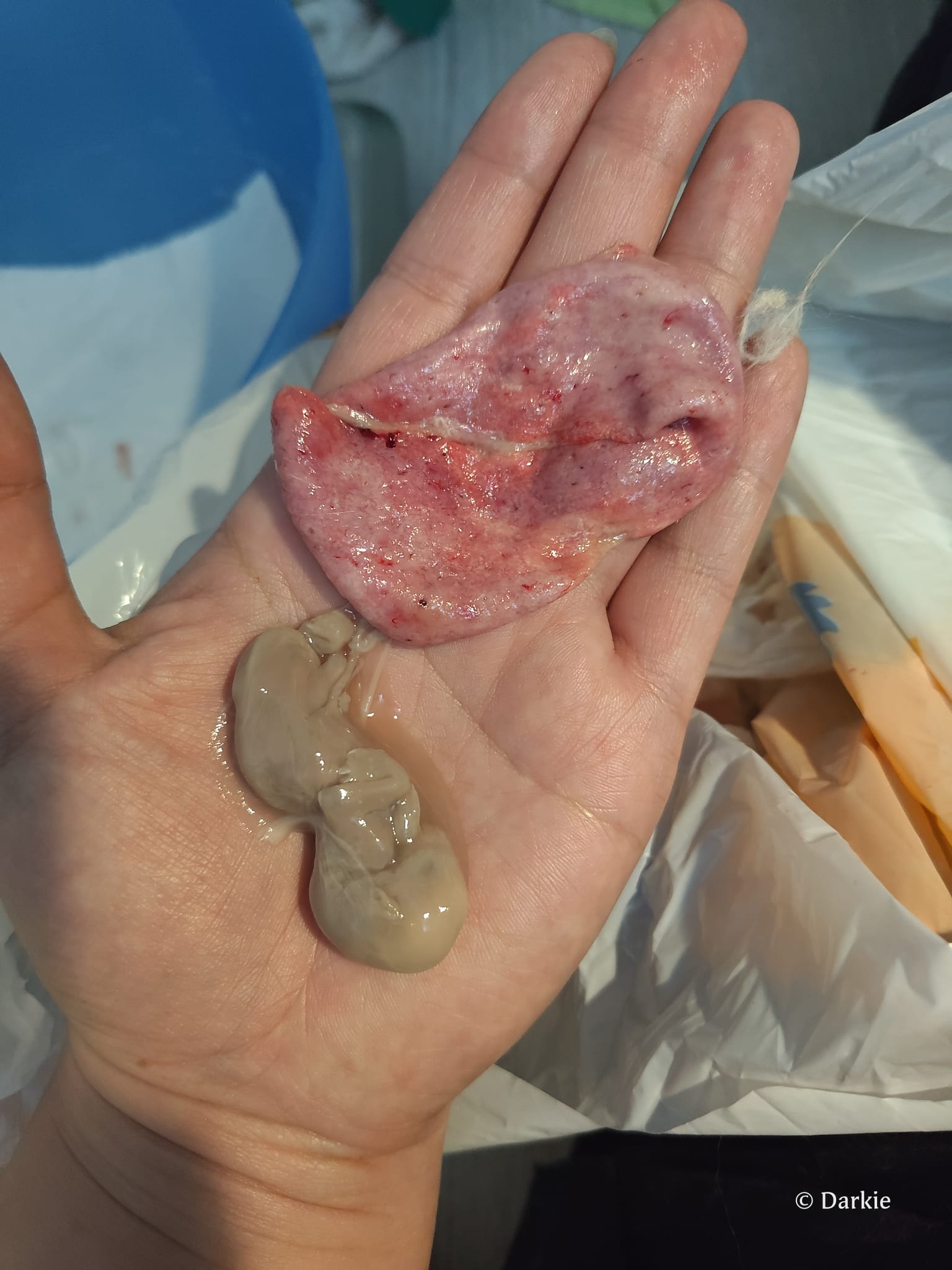 I hadn't taken her to ultrasound or xray to see how many kittens were inside, in hindsight it would've been nice to have a bit of knowledge before she started - she had 12 fetuses attached to her uterus, TWELVE! One of these had passed away a bit before birthing and was stillborn, another fetus had aborted at around 40 days of gestation. The fetus had distinctive features - legs and overall it's build was that of a cat, some bones had formed already but it's placenta was completely pale and leather-like, it felt like it was dry. I believe the placenta had deattached for one reason or another and it had then stopped developing. For those interested I have uploaded photos of the aborted fetus purely for educational purposes, VIEWER DISCRETION IS ADVICED, photo 1, photo 2.